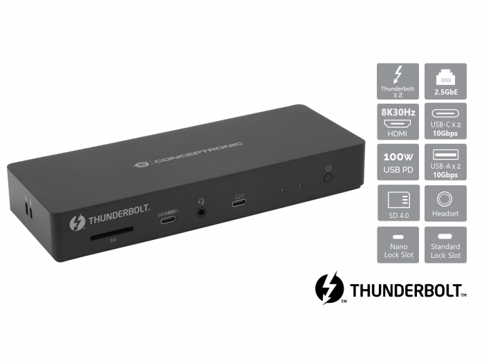A Conceptronic DONN30B 13 az 1-ben Thunderbolt 4 dokkolóállomáson két Thunderbolt 4 port, egy HDMI-kimenet, 2,5 GbE-s Ethernet, két 10 Gbit/s-os USB-C és két, szintén 10 Gbit/s-os, USB-A port található. Mindemellett egy SD 4.0-s kártyaolvasó is helyet kapott UHS-II támogatással az akár 312 MB/s-os adatátvitelhez, ami különösen hasznos a folyamatosan úton lévő fotósoknak és alkotóknak.