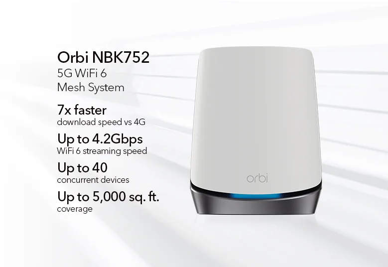 A mobilszolgáltatóknál már széles körben elérhető 5G lefedettséggel a nagy sebességű internetkapcsolat napról napra elérhetőbbé válik. Ennek hatására a NETGEAR bemutatta az iparág első 5G tri-band mesh rendszerét, amely egyesíti a szupergyors 5G mobilkapcsolatot a NETGEAR díjnyertes Orbi WiFi 6 mesh rendszerével, hogy hihetetlenül gyors sebességet és felülmúlhatatlan teljesítményt nyújtson alacsony késleltetéssel megszakítás nélkül. Az új Orbi NBK752 mesh rendszer „feladatátvételi” funkcióval is rendelkezik, így ha a vezetékes internetkapcsolat meghibásodik, azonnal képes átkapcsolni 5G üzemmódba. Rugalmasságából adódóan ideális megoldást kínál másodlagos otthonokhoz, nyaralókhoz, ideiglenes munkaterületekhez, továbbá bárhol máshol is használható, ahol nincs szükség a vezetékes internetkapcsolatra az év minden napján.