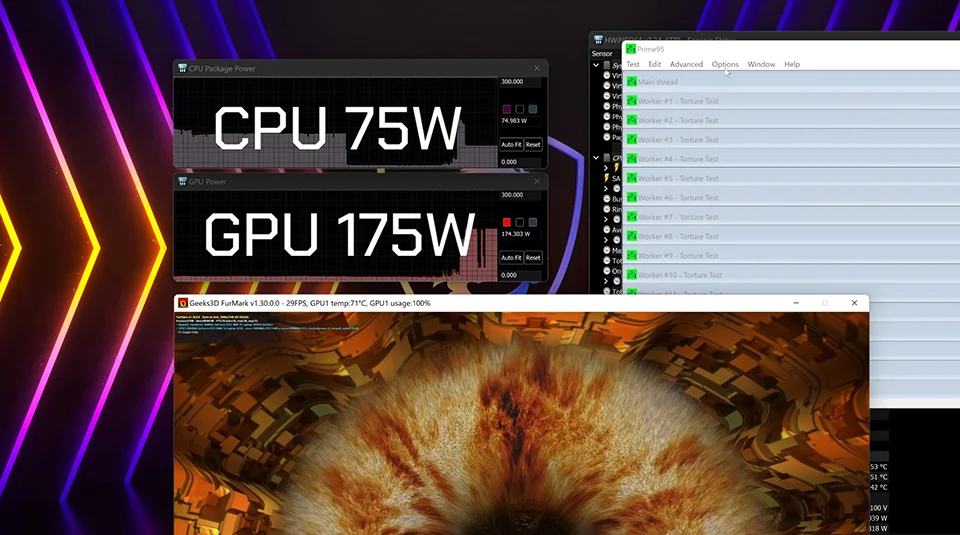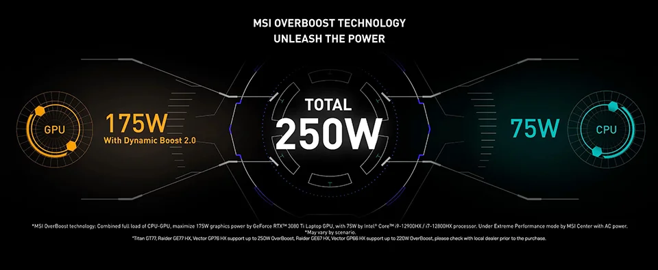Az MSI mérnöki erőfeszítéseinek köszönhetően az új Titan GT77, Raider GE77 HX és Vector GP HX sorozat az OverBoost technológiával akár 250 W-os teljesítményt is képes leadni akkor, amikor a GPU és a CPU teljes terhelés alá kerül!