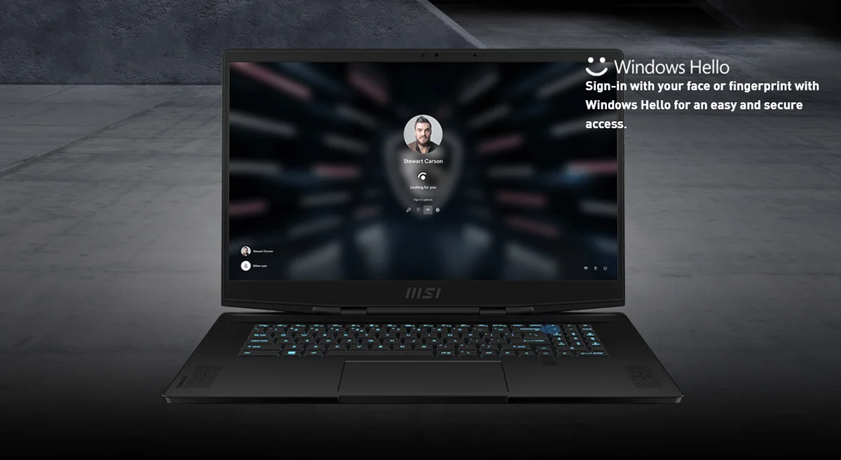 Az RGB-háttérvilágítású billentyűzet alatt egy ujjlenyomatolvasó is található, emellett a laptopon egy Full HD IR-kamera is helyet kapott, ami mellé biometrikus szenzorok is kerültek, így a laptop támogatja a Windows Hello bejelentkezés mindkét változatát.